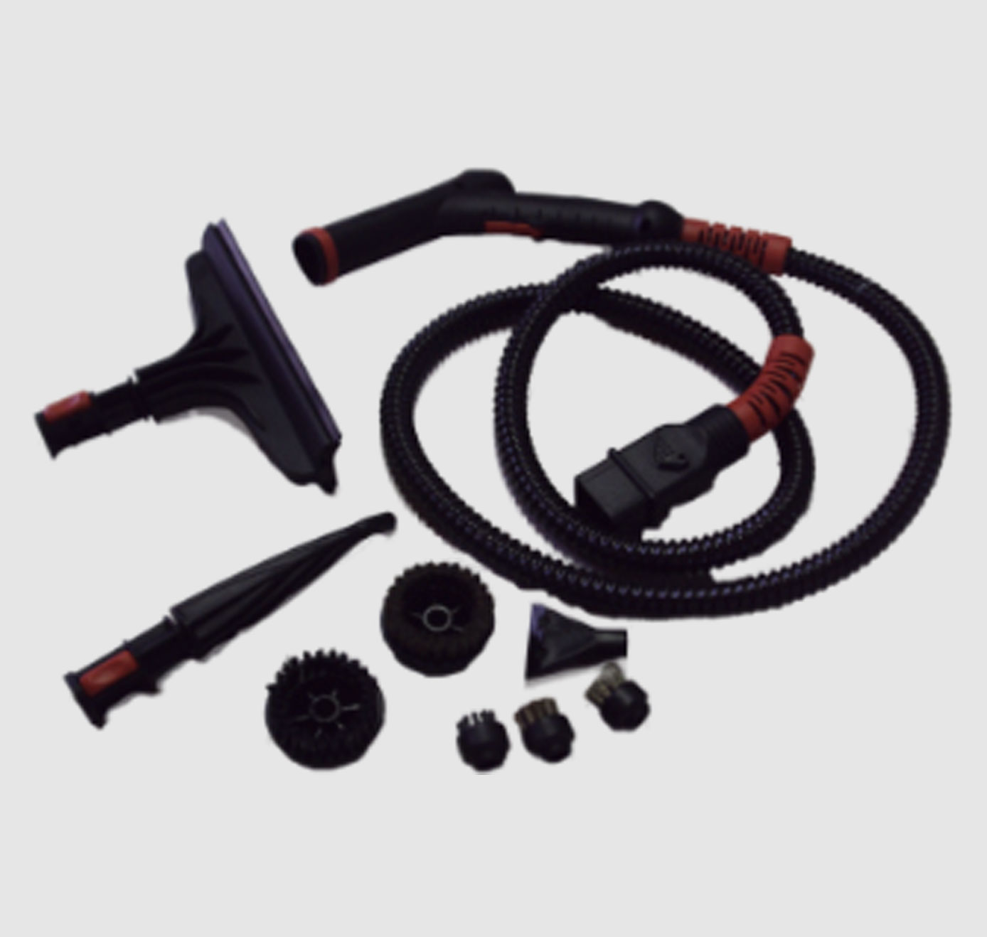 La macchina è dotata di vari accessori che ne aumentano la versatilità: Mono tubo flessibile, due prolunghe, spazzola rettangolare e triangolare, diverse tipologie di lancia, spazzolini da applicare sulle lance, spazzola tergivetro.