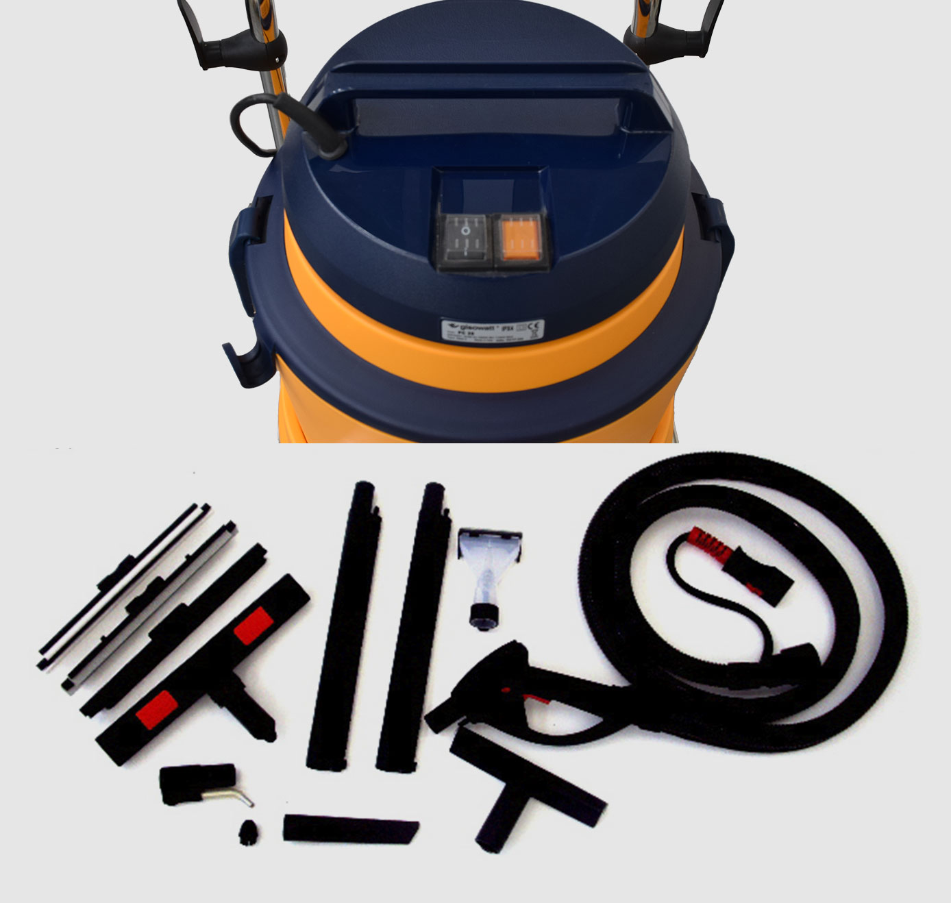 La macchina è dotata di vari accessori che ne aumentano la versatilità: tubi di prolunga, bocchetta piatta, bocchetta di aspirazione per tappezzeria, spazzola rettangolare con setole intercambiabili e lancia con due spazzole.